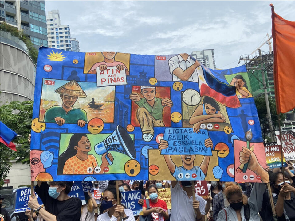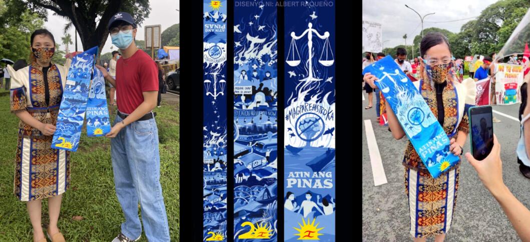 A sash worn by Kabataan Partylist Representative Sarah Elago. The very inspiration of this year's sash are the Filipino people- our rights and welfare. It represents the youth and people's demands in the midst of the circumstances caused by the pandemic in addition to KPL's celebration of two decades of championing education and health for all. A portion of the sash pays tribute to the work of social realist, painter, and printmaker Neil Doloricon.